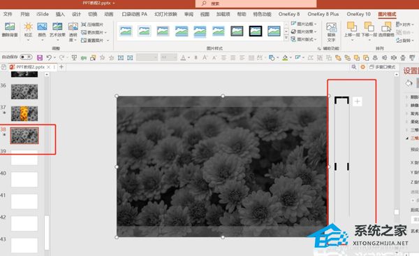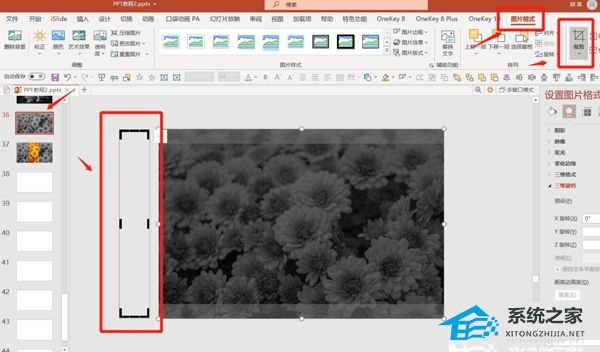 点击第一个PPT-点击彩色的图片-图片格式-裁剪-将裁剪框移动到PPT页面外-将裁剪框缩小。