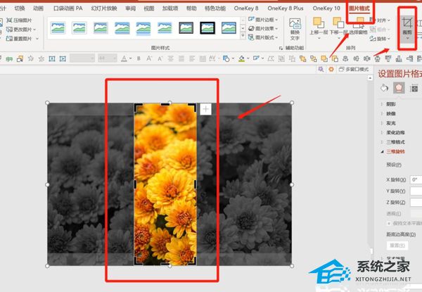 将复制好的图片放到灰色图片上方-点击图片格式-裁剪-调整裁剪框的大小和位置。