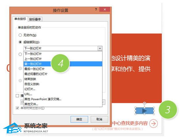 然后在后一张幻灯片处拖拽一下,自动回弹出“操作设置”菜单,选择超链接到“第一张幻灯片”,搞定。