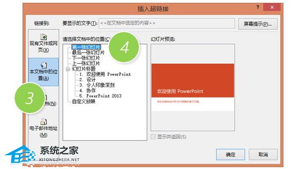 然后在新弹窗口中,选择“本文档中的位置”,在右侧文档中的位置选择“第一张幻灯片”。然后单击确定搞定。