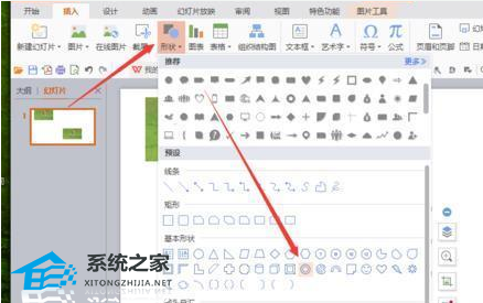 4、在打开的插入菜单选项卡下,依次点击“形状”–>“同心圆”图形。如图所示。
