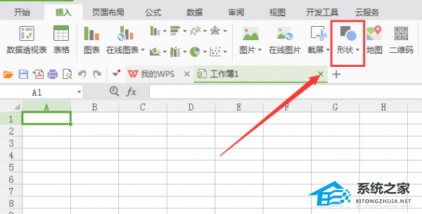 3、点击插入选项,在其编辑工具区里找到形状选项,如图所示: