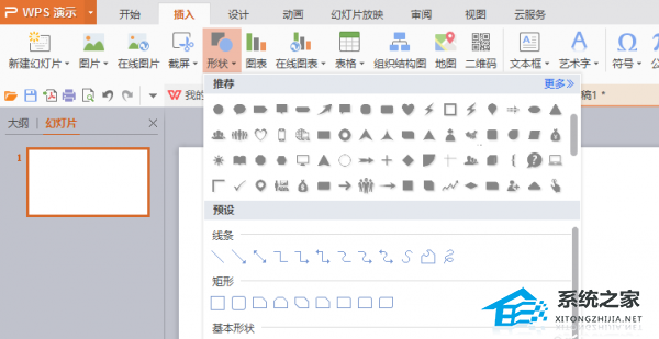 2、选择演示文稿,然后在“插入”的“图形”中选择元素。我们在这里使用椭圆、圆角矩形、菱形和箭头线。