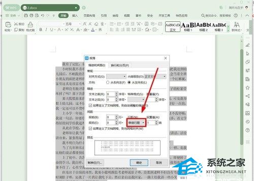 5、 第五步,接下来,请大家在“间距”选项中点击“行距”下面的下拉箭头,我们需要在下拉菜单中点击自己所需的行距。