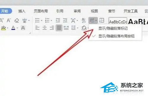 3、弹出的下拉菜单中,选择显示/隐藏段落标记的菜单项。