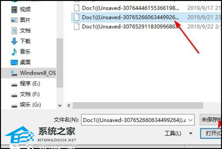 5、然后点击选中我们未保存的文档,之后点击打开。