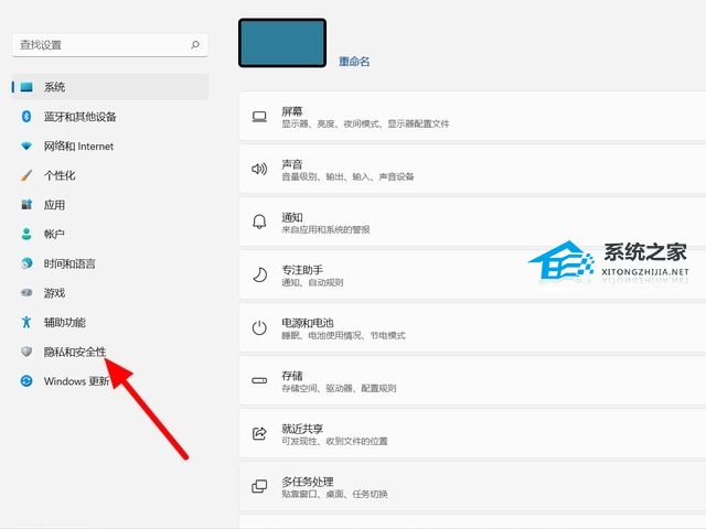 1、在键盘上按下快捷键【win+i】打开设置,在设置页面,点击【隐私和安全性】。