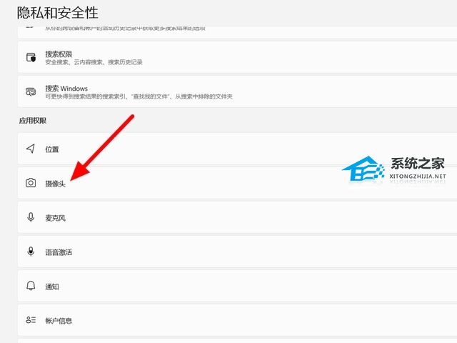 2、在隐私和安全性页面,找到应用权限,打开应用权限下的【摄像头】。