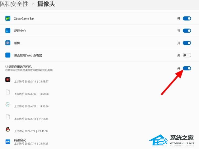 3、在摄像头界面,开启【让桌面应用访问相机】右侧的开关,这样电脑上画面就可以正常地出现。