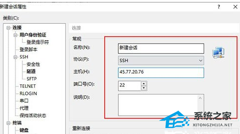 2、然后在弹出来的信息界面填写上连接名称,服务器lP和服务器端口,(默认为22)。