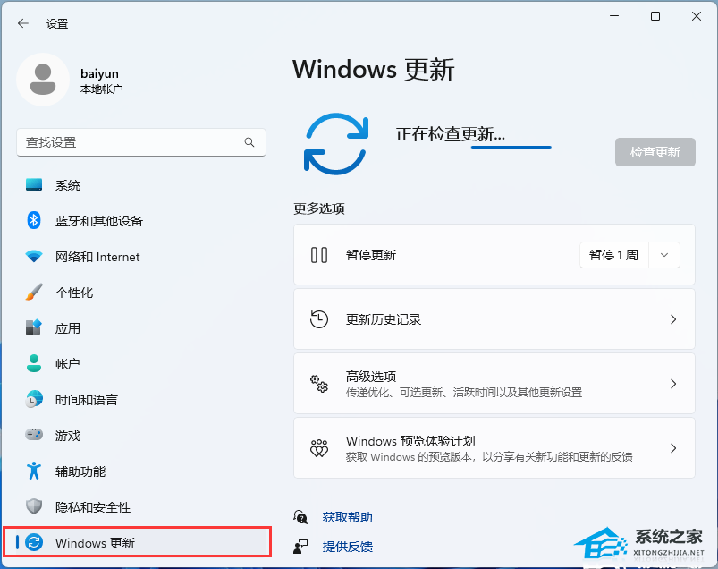 2、设置窗口,左侧边栏,点击【Windows 更新】,右侧就可以看到Windows正在检查更新;