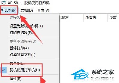 5、点击左上角的打印机,将“脱机使用打印机”前面的√取消即可。
