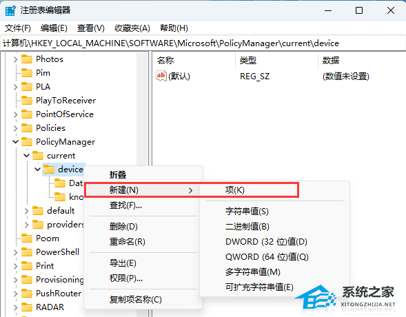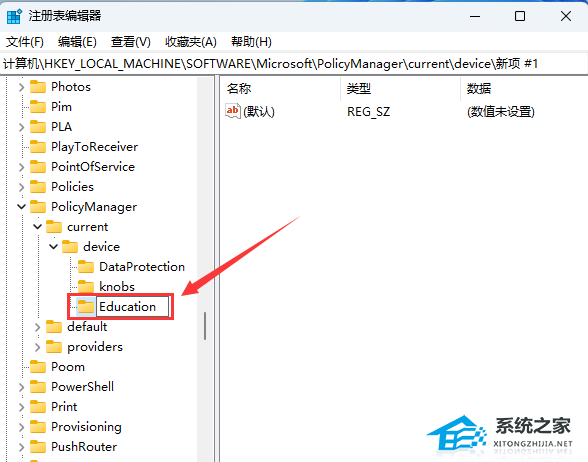 4、右键点击【device】,在打开的右键菜单项中,选择【新建 - 项】,并重命名为【Education】;