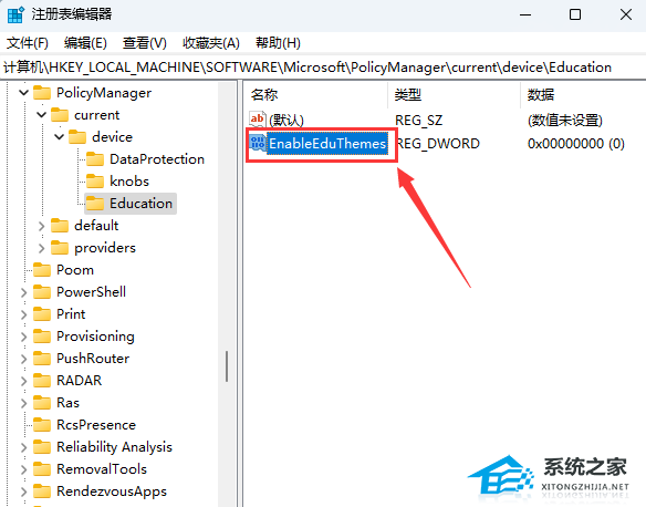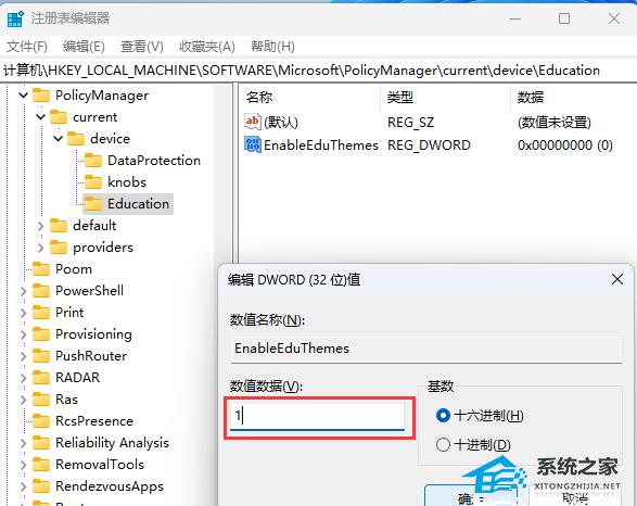 6、双击【EnableEduThemes】,编辑 DWORD (32 位)值,将数值数据修改为【1】启用教育主题,为【0】禁用教育主题;