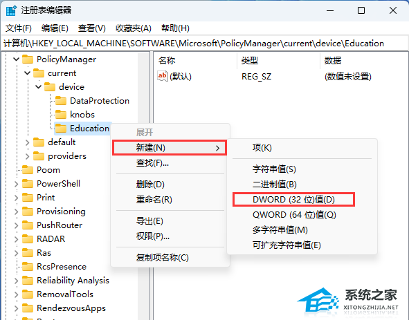5、接着,右键点击【Education】,在打开的右键菜单项中,选择【新建 - DWORD (32 位)值(D)】,并重命名为【EnableEduThemes】;