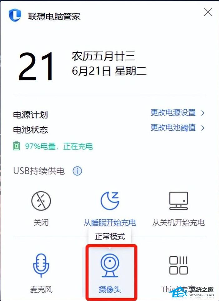 1、ThinkPad预装【联想电脑管家】机型可左键单机桌面右下角电池图标,点击灰色的摄像头选项,即可打开摄像头,查看问题是否解决。