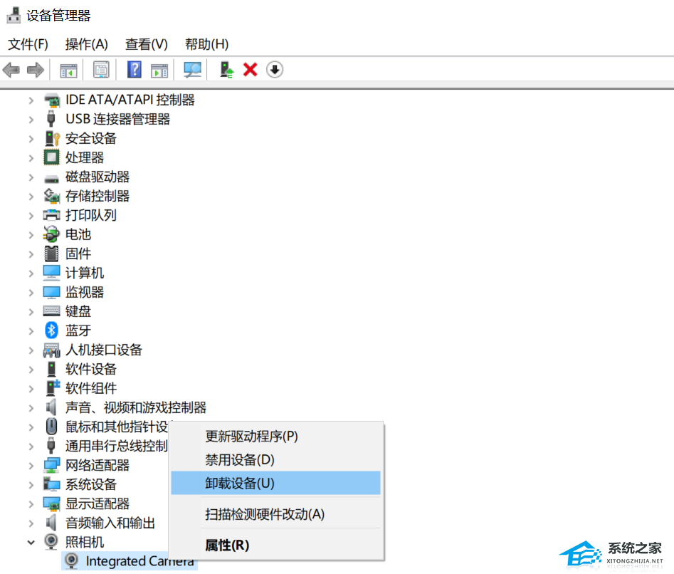 4、右键【摄像机】下的【Integrated Camera】,选择【卸载设备】,如果有对话框弹出【删除此设备的驱动程序软件】打勾,如果没有,直接卸载。