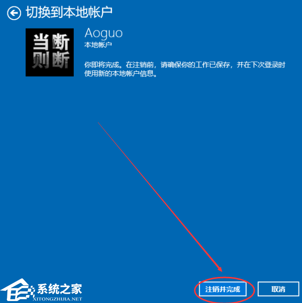 4、然后在弹出的窗口中点击“注销并完成”,win10系统的微软账户退出成功,问题解决。
