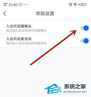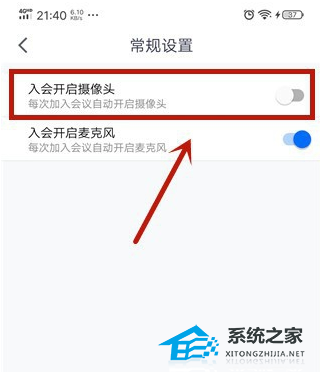 4、然后在设置中,点击“入会开启摄像头”后面的开关。