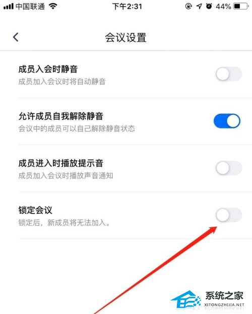 4、如图,在打开的会议设置页面,我们就可以看到“锁定会议”的选项了。