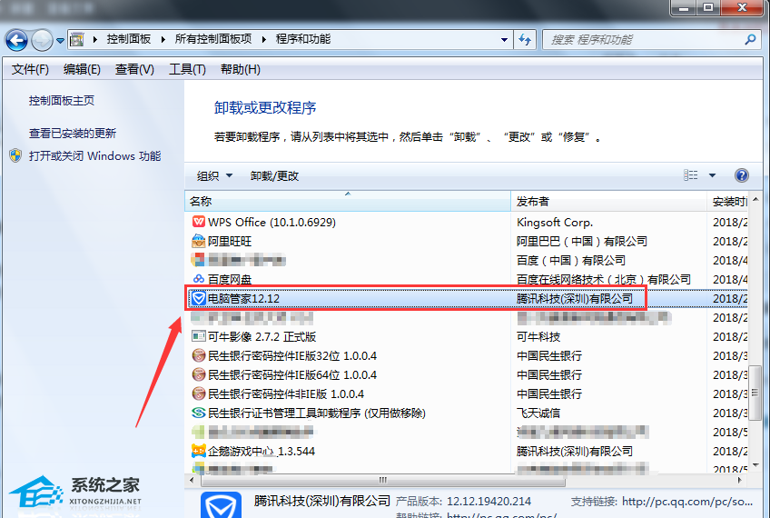 3、搜索找到电脑管家,点击鼠标的左键选择卸载按钮。