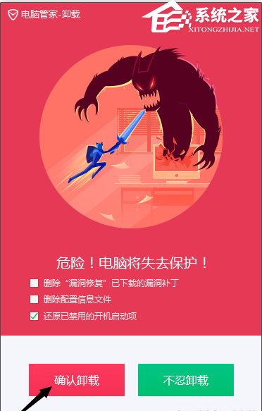 8、弹出提示“卸载电脑管家将会使电脑失去保护,极大增加木马入侵的风险。您是否要继续卸载”,我们点击【是】。