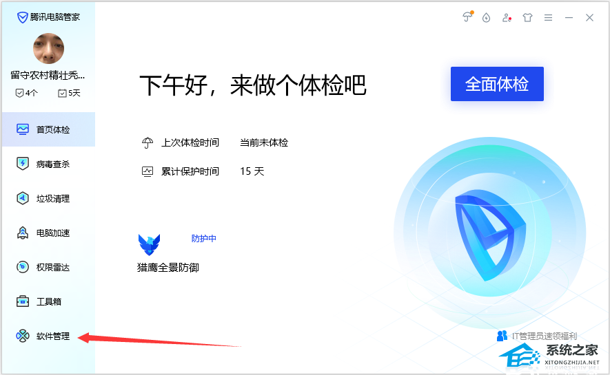 1、在这方面,腾讯还是比较人性化的,可以通过自己的软件卸载自己。我们打开电脑管家,找到底部的【软件管理】。