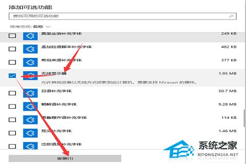 3、找到“无线显示器允许其他设备以无线方式投影到此计算机”,需要支持 Miracast 的硬件,勾选并点击“安装”。