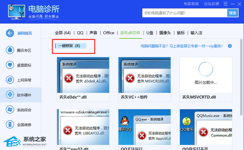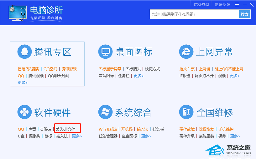 4、这时用户就打开了电脑诊所窗口,在软件硬件板块中点击丢失dll文件选项来进行设置。