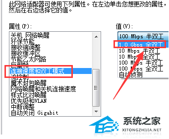 4、随后在左边选中“连接速度和双工模式”,右边的值一个个试,看看哪个可以用就能解决了。
