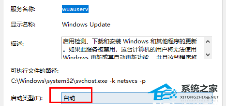 4、然后返回到服务页面中,打开“windows update”,在启动类型中选择“自动”,并点击服务状态下方的“启动”再重启就好了。