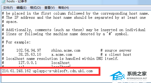 7、我们将h0sts文件加入210.61.248.162 uplaypc-s-ubisoft.cdn.ubi.com,或者也可以直接复制以下内容进行覆盖。