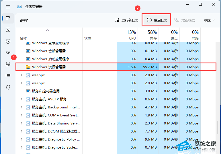 3、选择【Windows 资源管理器】进程后,再点击右上方的【重启任务】,即可重启Windows 资源管理器,这其实是Windows 资源管理器进程explorer.exe结束后,又重新启动的过程;