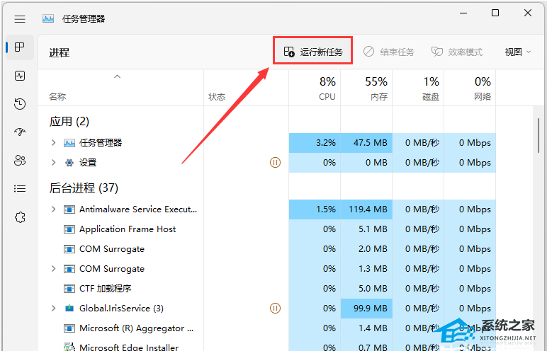 4、如果不小心结束了Windows 资源管理器进程,也可以在任务管理器窗口,点击右上方的【运行新任务】;