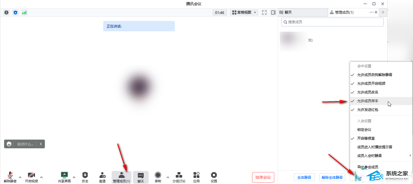 6、在会议视图界面下方点击“管理成员”按钮后可以在成员栏中点击“更多”按钮,设置想要的成员权限,比如允许成员举手发言等等。