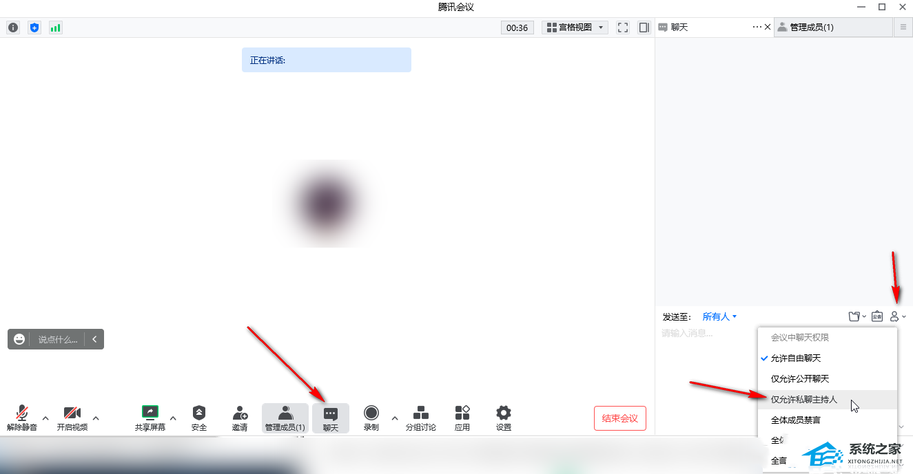 4、进入会议视图后,点击界面下方的“聊天”按钮,然后在右侧出现的聊天栏中点击人像图标并在展开的选项中点击“仅允许私聊主持人”;