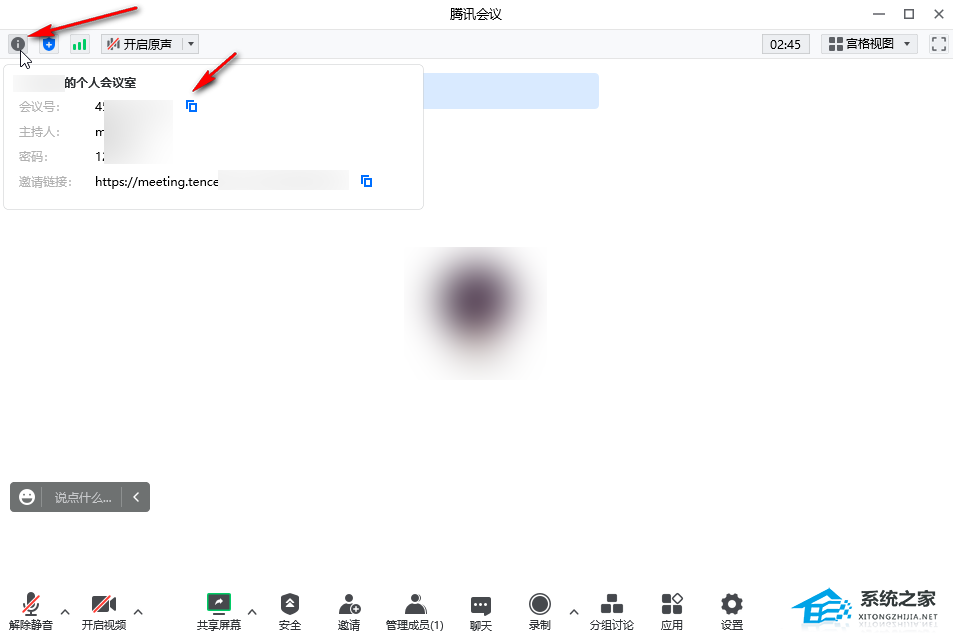 方法2:在界面左上角点击如下图所示的图标后,可以在展开的选项中看到会议号等信息,点击旁边的按钮可以进行复制。