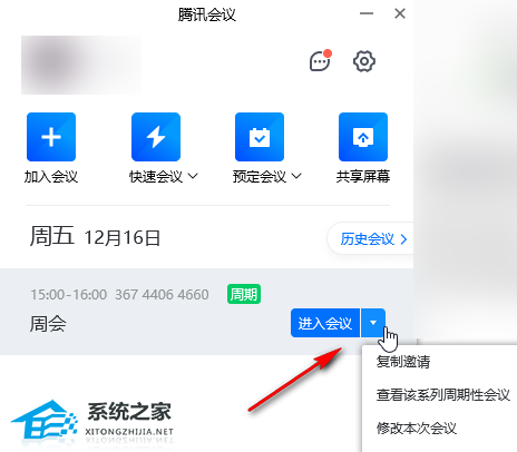 方法3:如果是预定的会议,可以将鼠标选题到会议上后,点击下拉箭头并在子选项中点击“复制邀请”按钮,就可以在打开的窗口中看到会议号等信息了。