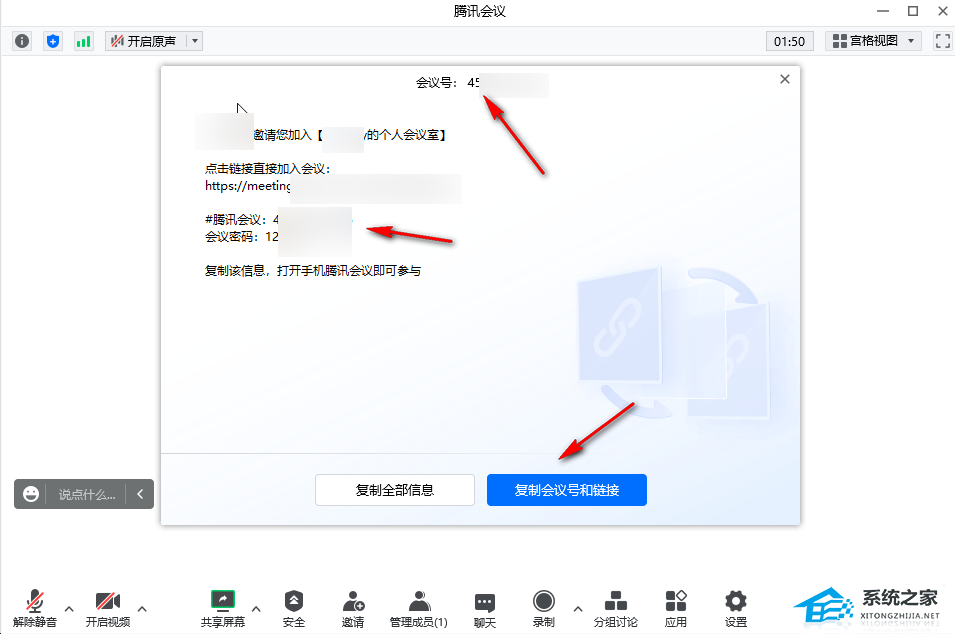 点击之后就可以在打开的窗口中看到会议号,会议链接,入会密码等信息了,可以在下方点击进行复制。
