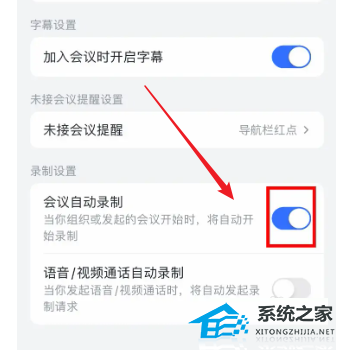 4、进入视频会议页面,点击打开会议自动录制右侧的【开关】即可(如图所示)。