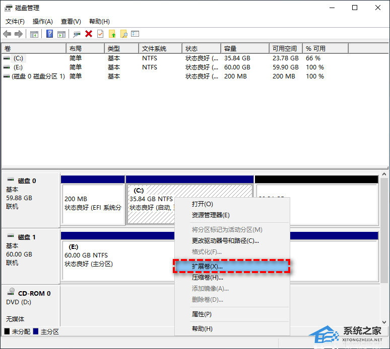 2、在主界面中右键单击C盘驱动器并选择“扩展卷”,然后按照提示流程操作即可扩展C盘空间。