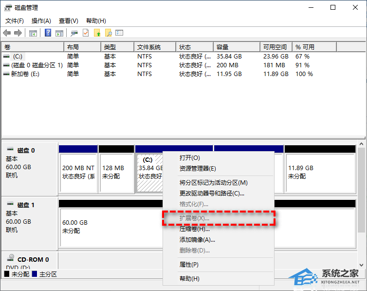 注意:虽然系统内置的磁盘管理工具可以通过“扩展卷”功能扩展C盘空间,但是它有严格的限制条件,只能合并C盘驱动器相邻右侧的未分配空间,如果不相邻则会出现无法扩展卷的情况。