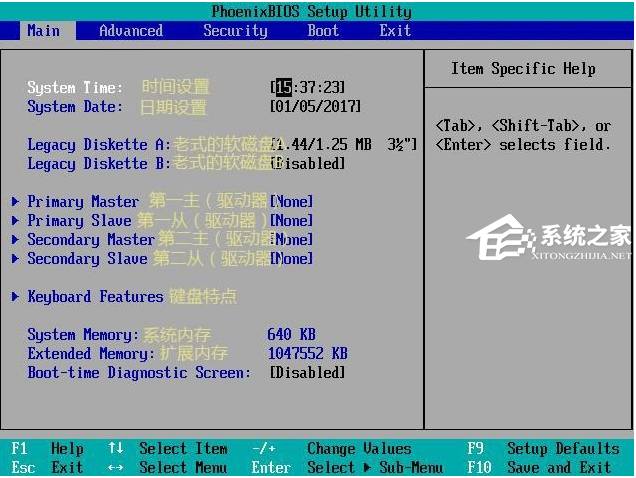 一般此界面也就如图几个选项。在BIOS界面下方我们可以看到一些快捷键,可以通过他们进行快速设备BIOS哦。