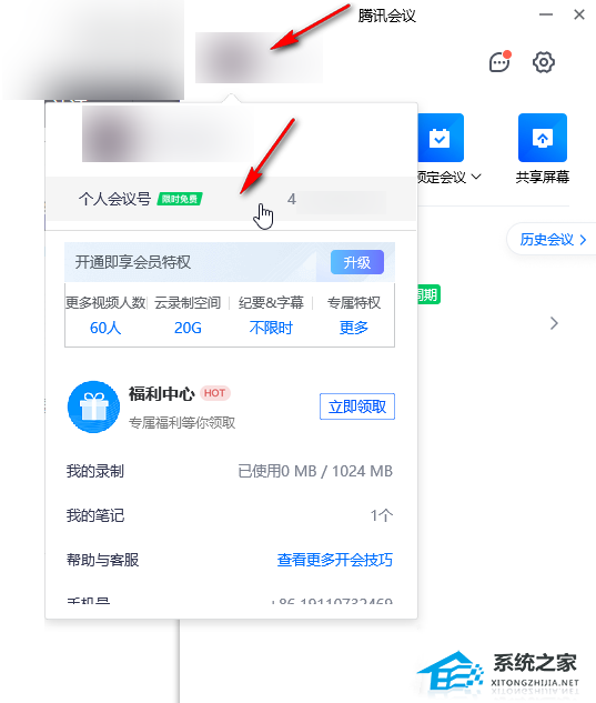 第二步:在主页上方点击自的头像并在展开的选项中点击“个人会议号”;