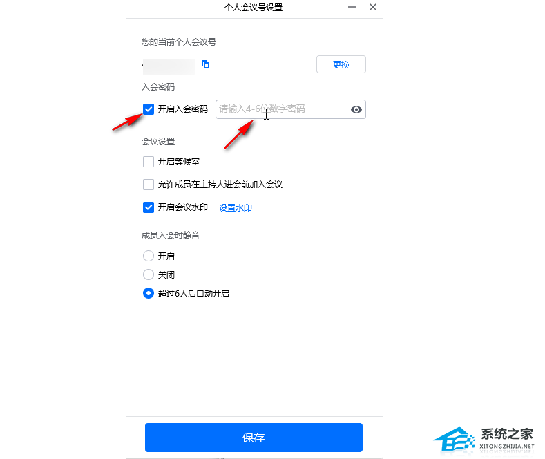 第三步:接着在新打开的窗口中点击勾选“开启入会密码”,然后在右侧录入想要的密码并点击“保存”就可以了;