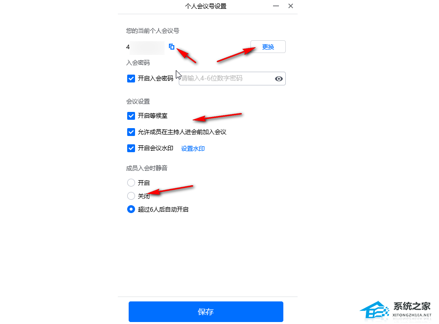 第四步:如果有需要我们还可以点击上方会议号旁边的图标复制会议号,点击“更换”按钮更换会议号,进行会议设置和入会时静音的设置;