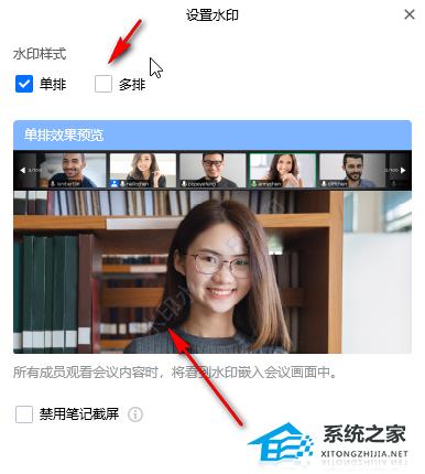 第五步:点击“设置会议”按钮后可以在打开的窗口中设置水印的样式,看到预览效果,然后点击“应用”按钮就可以进行应用了。