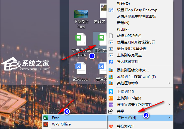 1、我们先在电脑中找到一个表格文件,然后右键单击选择“打开方式”选项,再选择使用“Excel”来打开该文件。