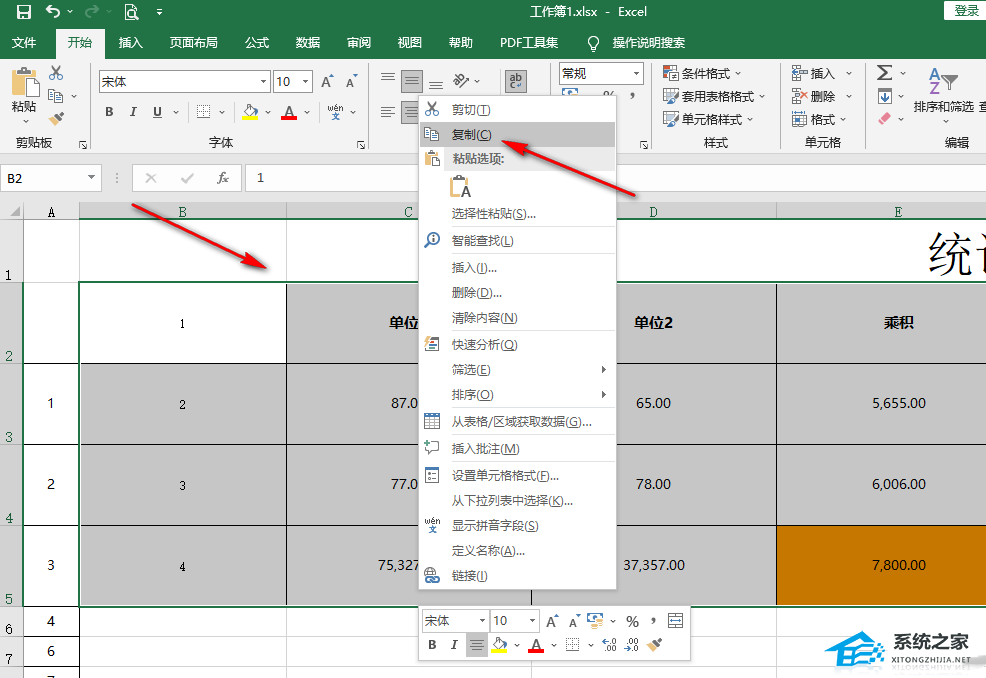 2、进入Excel页面之后,我们先输入或导入数据表格,接着我们选中需要行列互换的单元格,然后右键单击选择“复制”。