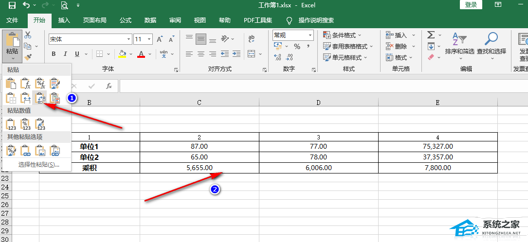 3、接着我们在表格中点击一个空白的单元格,然后打开“开始”工具,再在子工具栏中点击打开“粘贴”工具下的箭头图标。